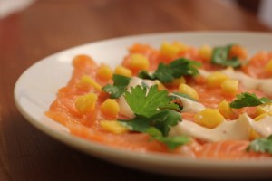 Tallerkenstekt laks med mango, koriander og chutney-dip