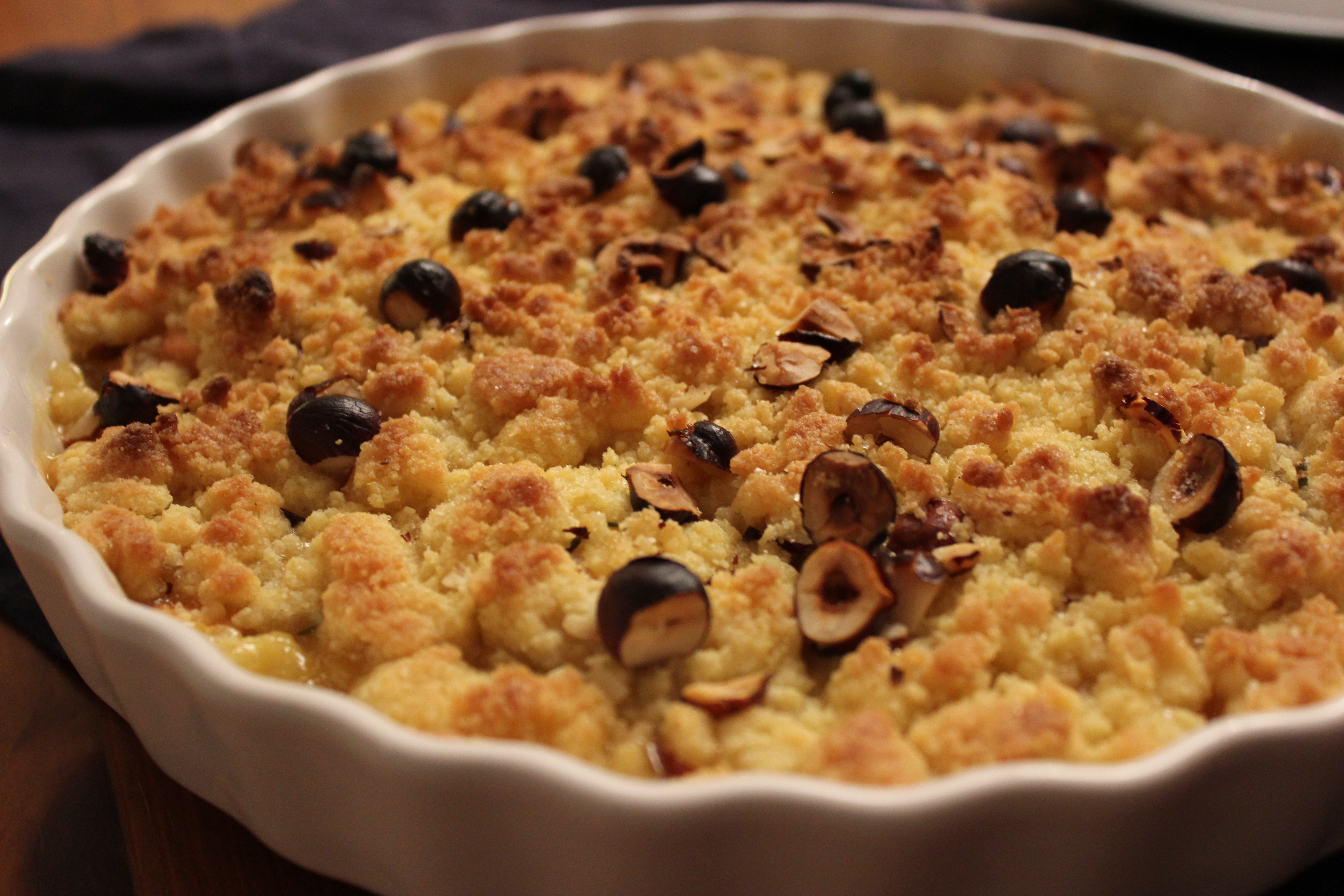 3) Bland smuldrepaideigen. Ta mel, sukker og (kaldt) smør i en bolle. Smuldre sammen deigen med fingrene, til alt er blandet godt sammen. Hakk hasselnøttene i to, bland forsiktig sammen med smuldrepaideigen. Strø smuldrepaideigen (og nøttene) over eplene. Strø litt sukker på toppen av det hele.