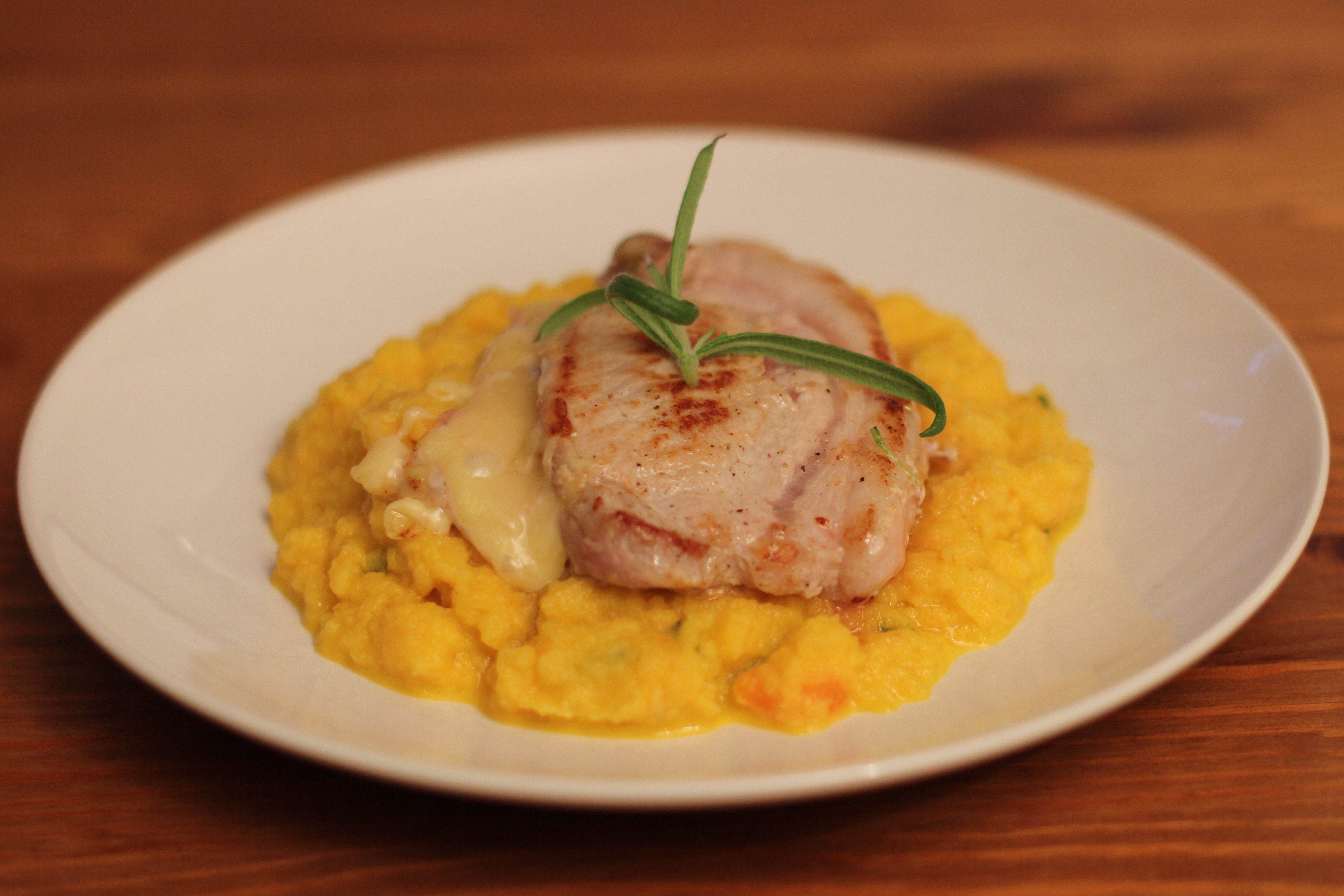 1) Skjær en lomme i svinekotelettene. Legg inn i lommen to osteskiver med en skinkeskive imellom. Salte og pepre, stek svinekotelettene på hver side slik at de blir karamellisert. Legg dem over i ildfast form og la dem steke  ca. 10 minutter i ovnen på 150 grader.