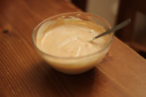 2) Rør sammen ingrediensene til sausen: bland sammen crème fraiche, mango chutney, rød curry paste og koriander som du har knust i en morter.