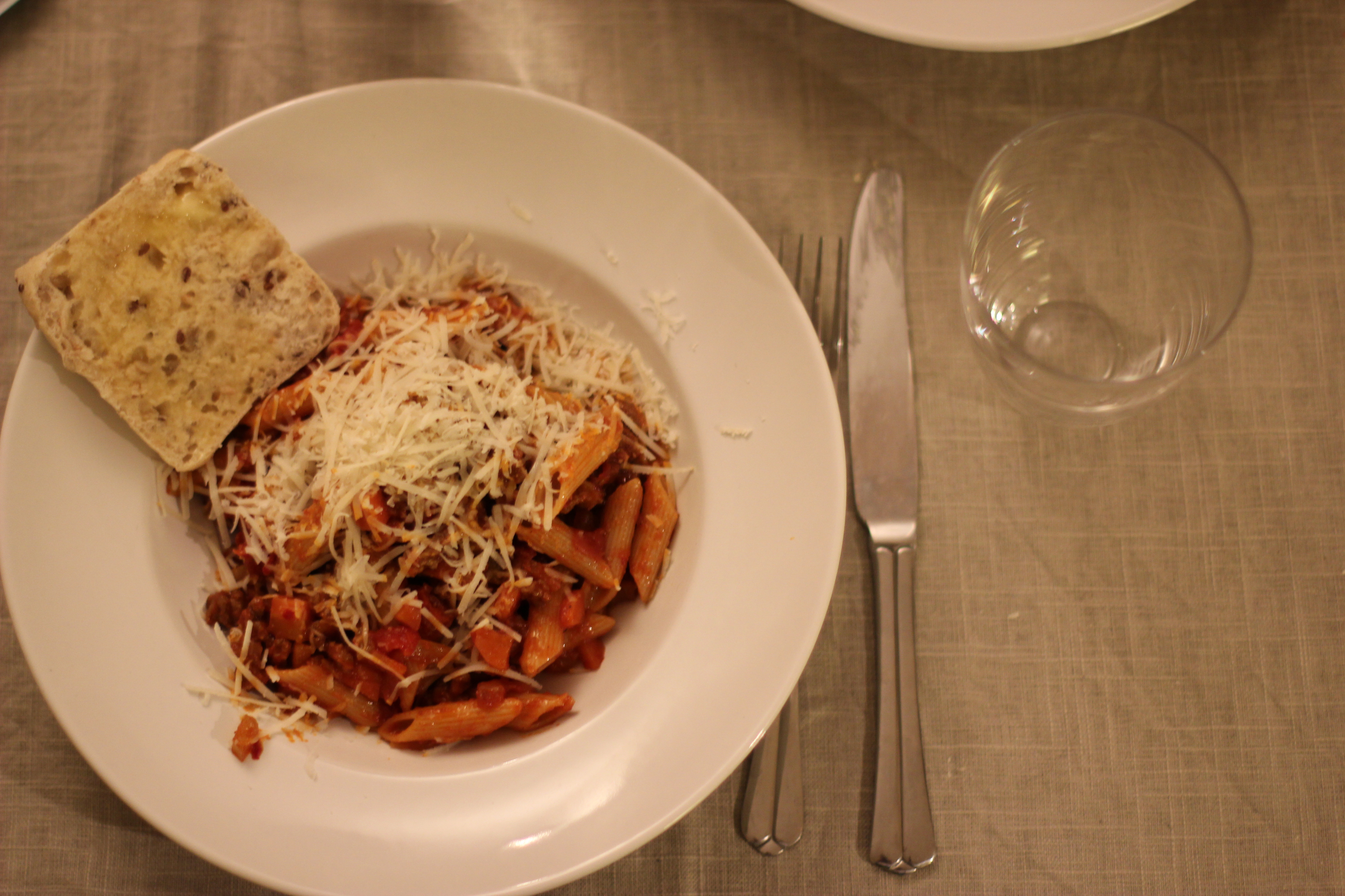 7) Smak til bolougnese-sausen med salt, pepper og sukker. Server pasta med sausen og revet ost på toppen. Og gjerne rundstykker med smør til.