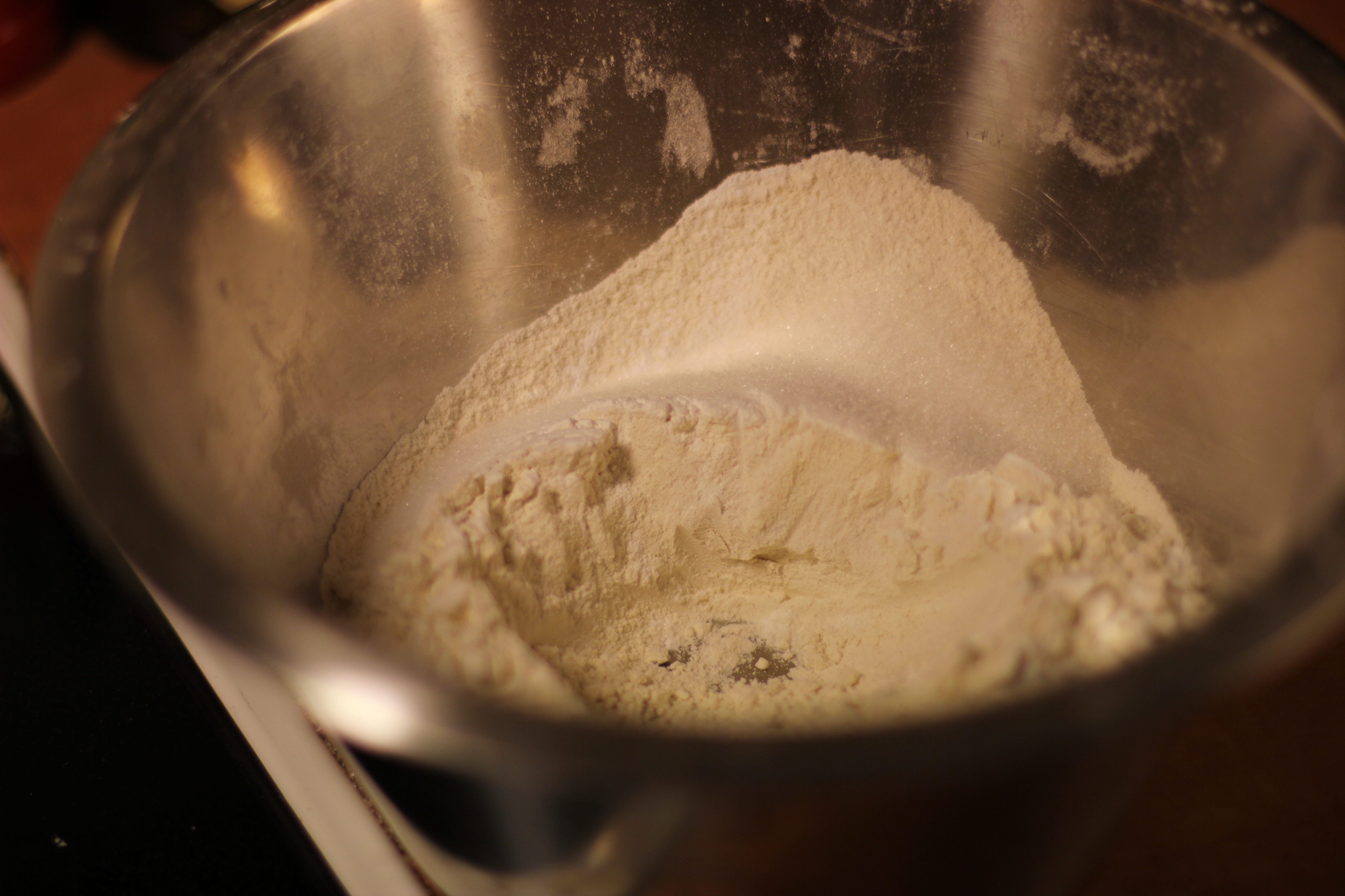 1) Ta det tørre (hvetemel, bakepulver, sukker og salt) og sikt det over i en stor bakebolle. Lag en grop i midten. Tilsett melk, sammenvispede egg og smeltet smør. Bruk en visp og bland inn litt og litt av det tørre etter hvert. Bland frem til du har fått en jevn og klumpefri røre. Hvis du har miksmaster kan du bruke det i stedet. Hvis røren er litt for tjukk, kan du ha oppi litt mer melk.