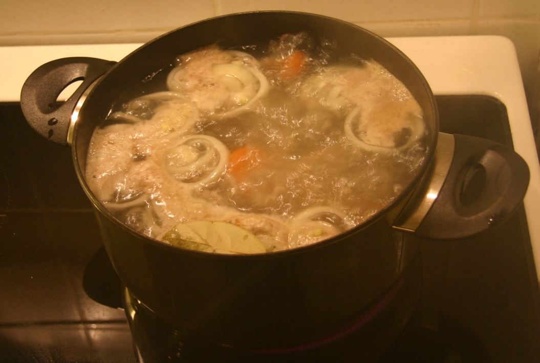 De legges så i en gryte som fylles med kaldt vann til det mer enn dekker beinene. Løk og gulroten kuttes opp og legges oppi sammen med et laurbærblad. Kok opp, og la koke (men ikke fosskoke) i ca fem til seks timer. I løpet av denne tiden vil det danne seg et grått skum på overflaten. Dette må fjernes fortløpende, ellers kan det ødelegge smaken.