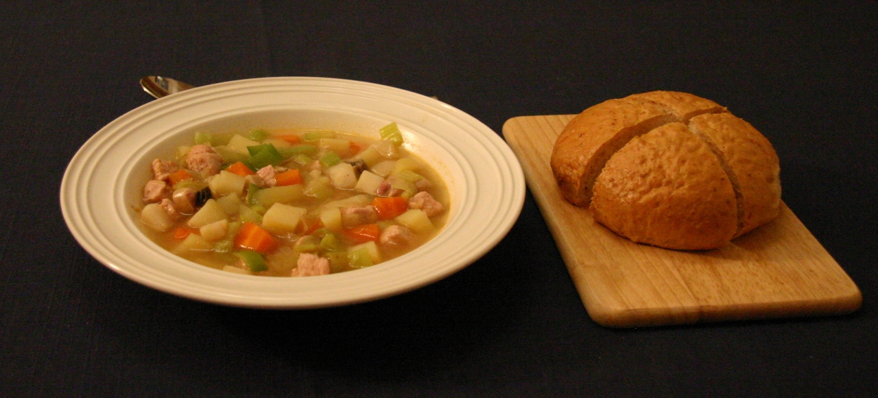 Skjær kjøttet i terninger og hakk løken. Brun disse i en stekepanne. Kutt grønnsakene i terninger, ha alt utenom purren i en gryte, og tilsett kraften. Kok opp, og la den trekke i ca 15 minutter. Purren kuttes opp i hele eller halve ringer, og taes oppi når det er ca 5 minutter igjen. Jeg pleier å bruke salt, pepper og paprikapulver i gryten. Det er vanskelig å si nøyaktig hvor mye, men jeg begynner med ca 1 teskje av salt og paprikapulver, og 1/4 teskje pepper, og så smaker jeg til etterhvert. Om man lager denne på en kald vinterkveld, så gjør det ingenting om den er litt sterk i smaken. Så serverer jeg med brød og smør til.
