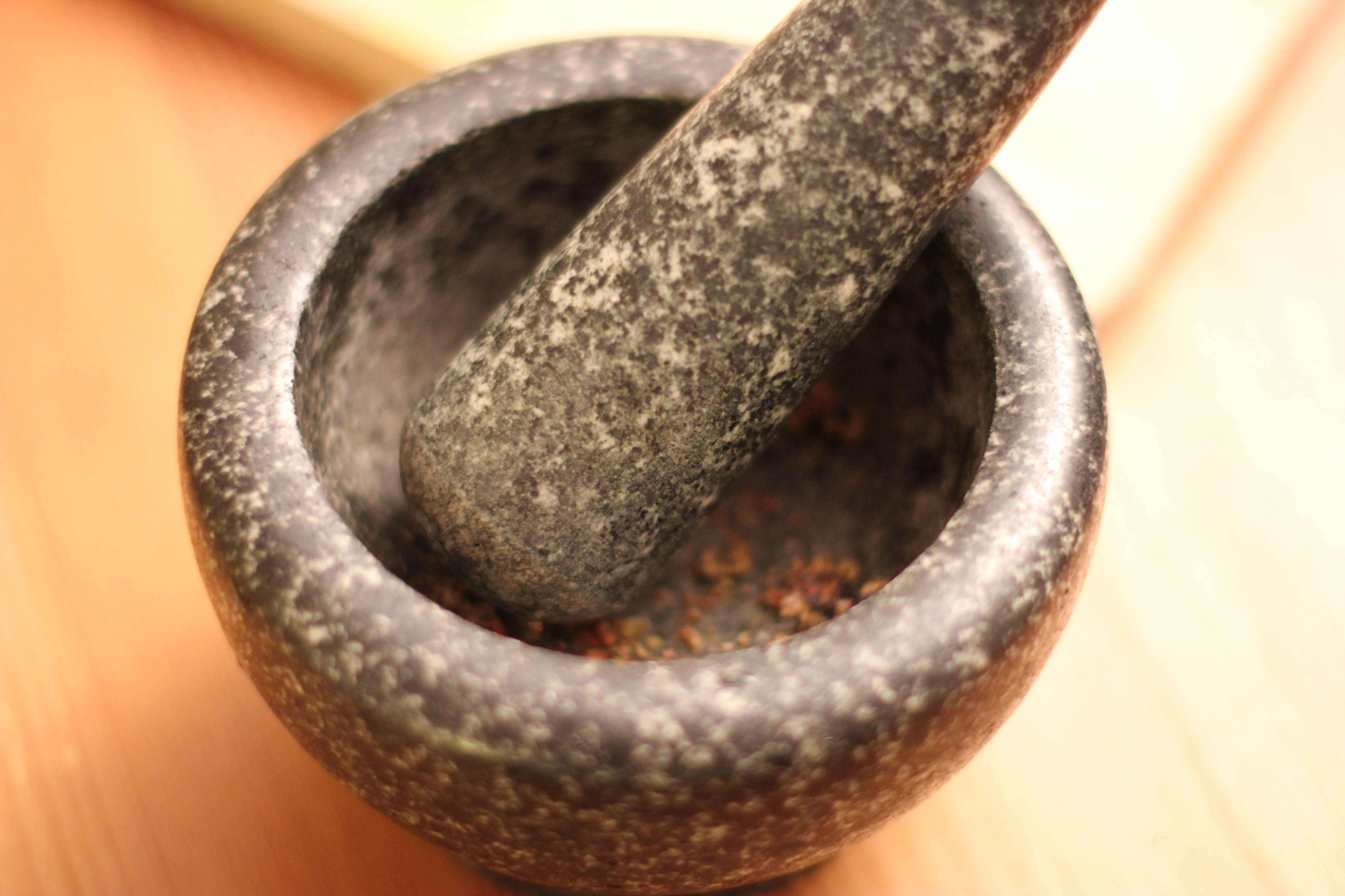 Hvis du ikke har morter, kan du bruke den ene siden av eggen på en kniv til å knuse enebærene (vær forsiktig så du ikke skjærer deg). Du kan også legge enebærene på en trefjøl og rulle sidene/kanten av en stekepanne over enebærene.