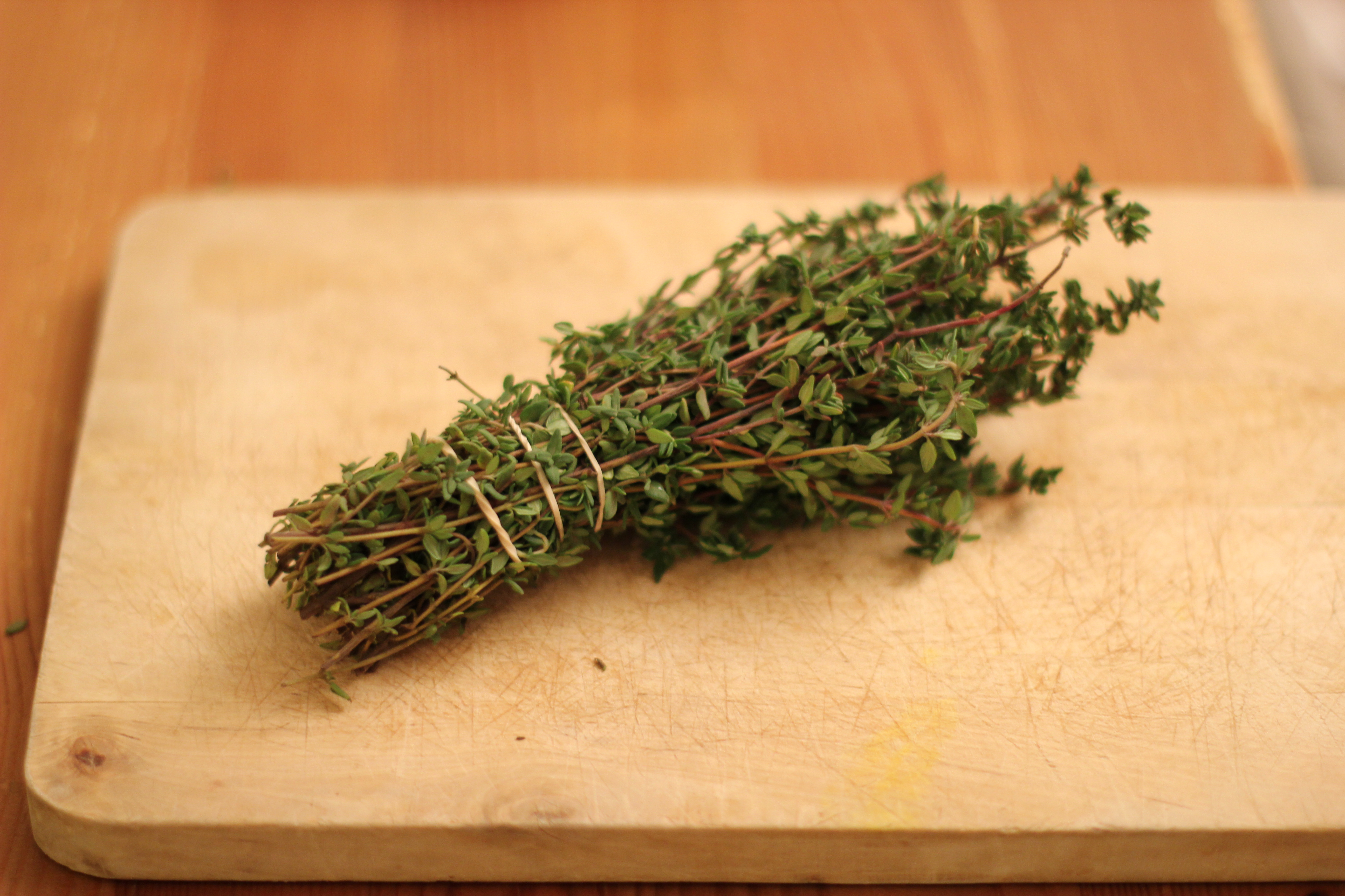 3) Timianen vaskes og bladene tas av stilken. Det er bare bladenen du skal bruke, du trenger ikke kutte timianbladene ytterligere, de har best smak hvis de er hele eller kun grovhakkede.
