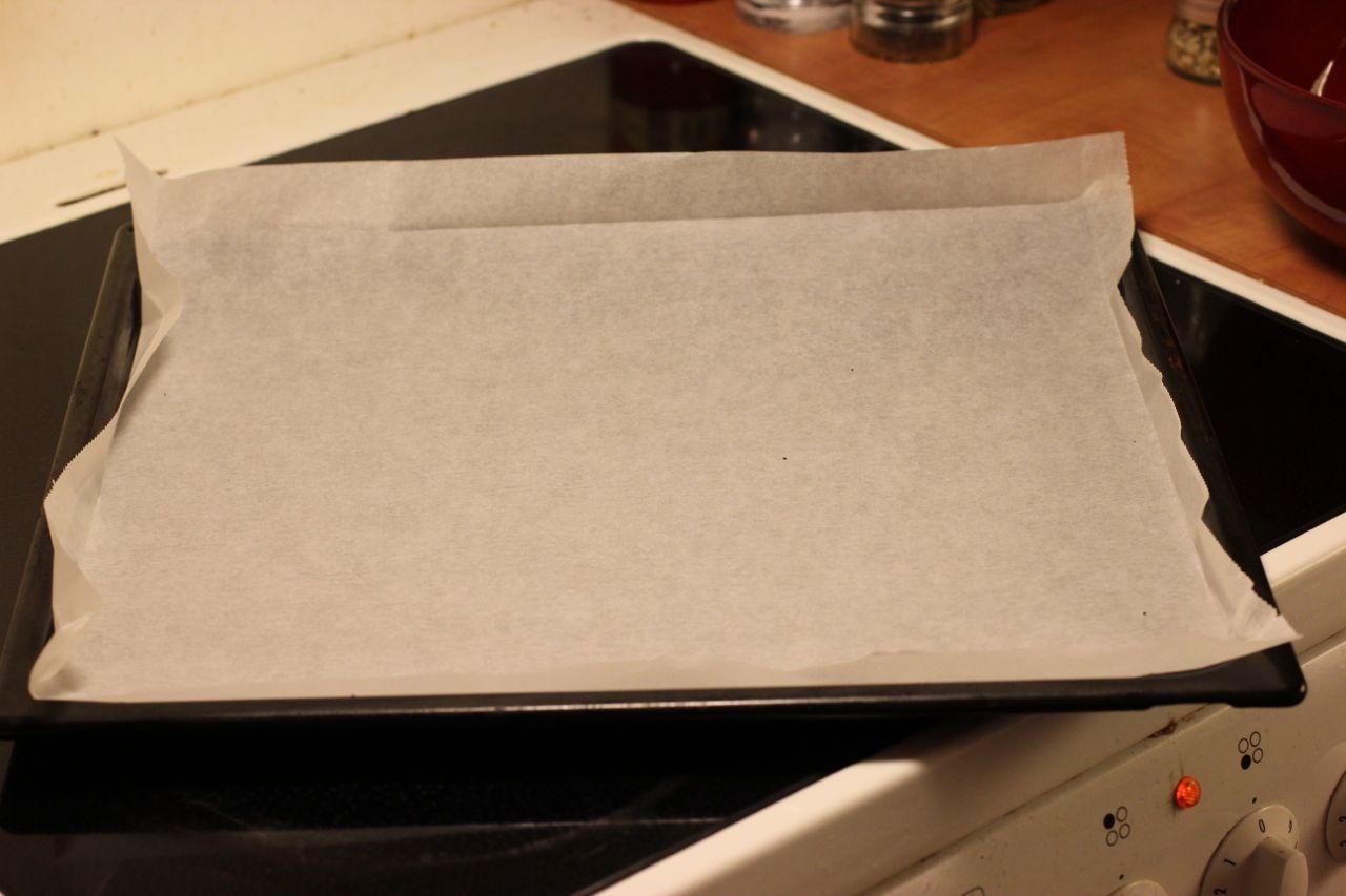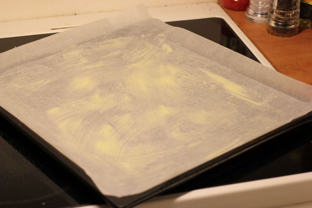 2) Legg bakepapir på en plate. Papiret må være like stort som platen. Smør papiret og brett en liten kant rundt slik at røra ikke flyter utover.