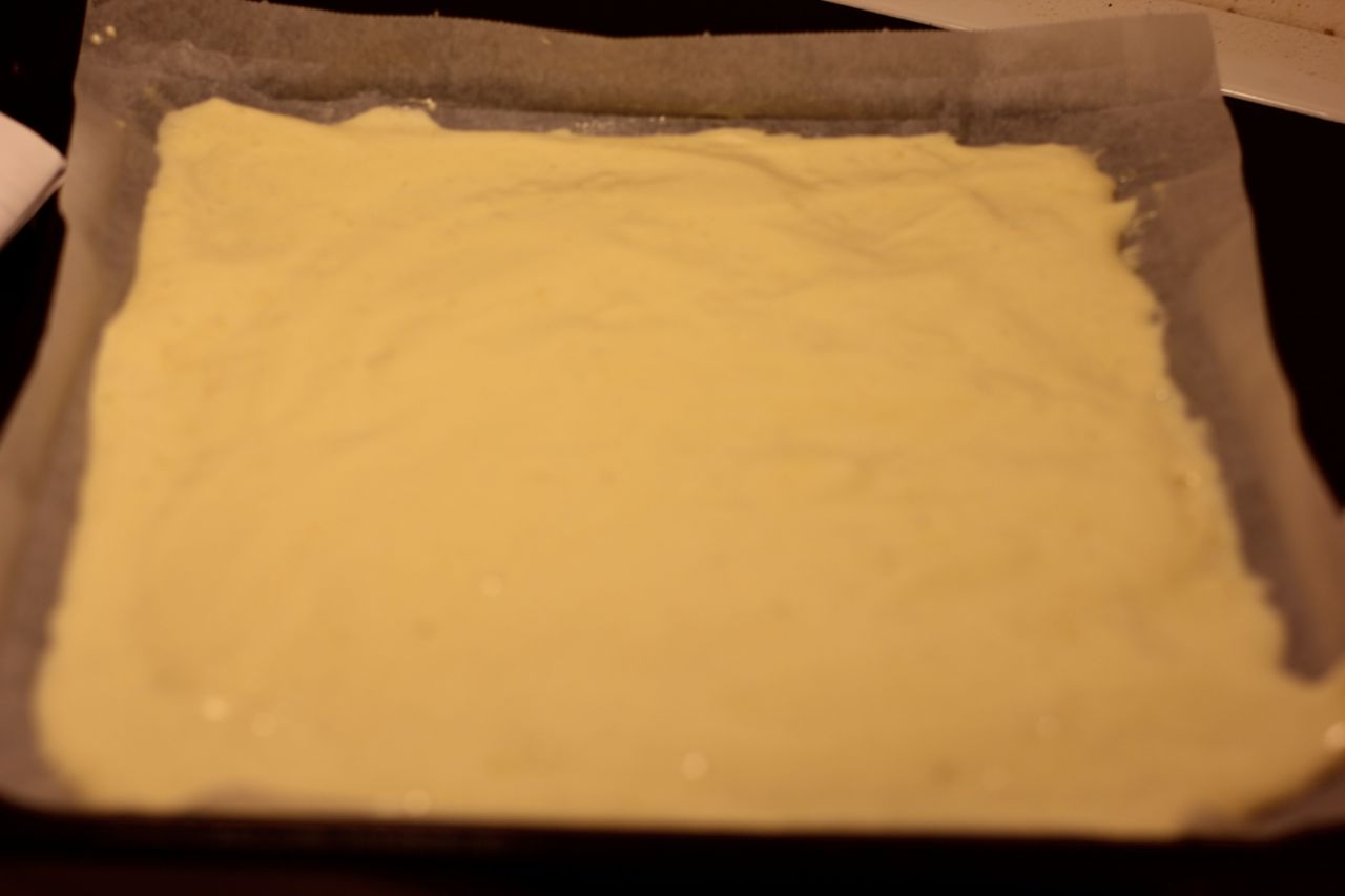 5) Hell røren over på det smurte bakepapiret og jevn utover med en slikkepott.