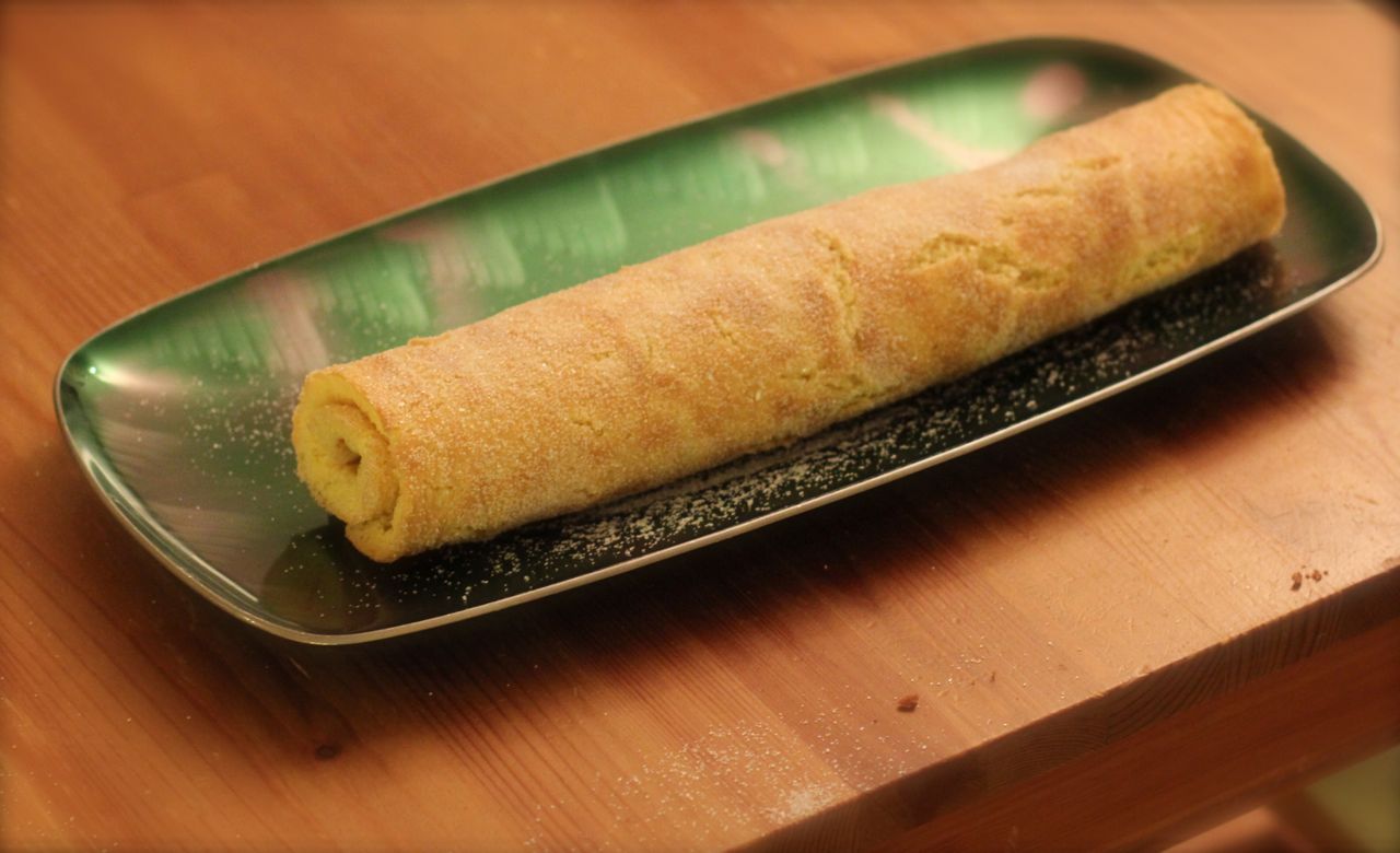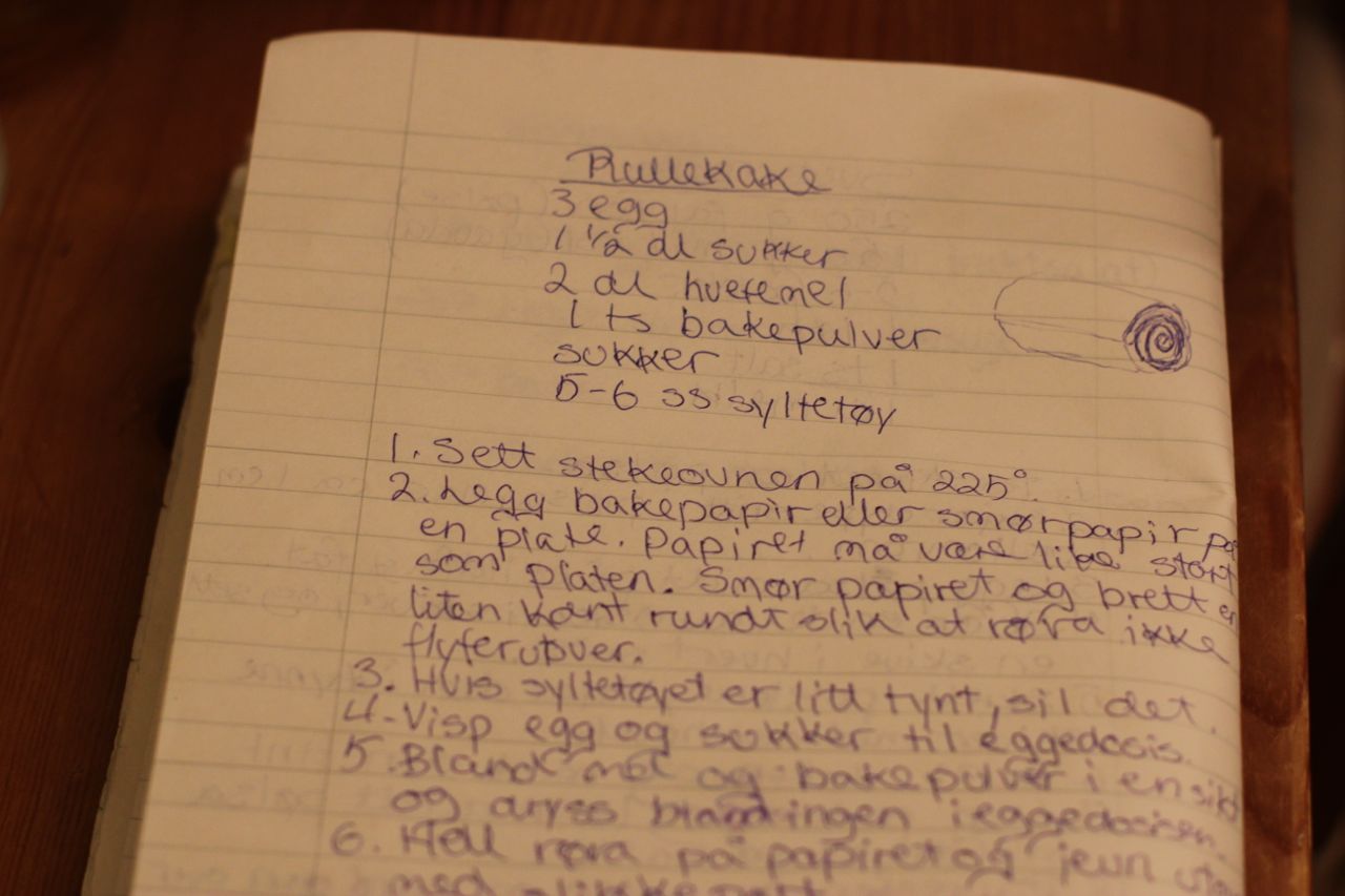 Denne gangen er det en klassiker fra heimkunnskapen som sto på dessertmenyen. Er det flere enn undertegnede som har laget rullekake i heimkunnskapen? Denne oppskriften er bokstavelig talt hentet fra min heimkunnskapsbok fra klasse 7c, der rullekaken til og med er tegnet. 🙂