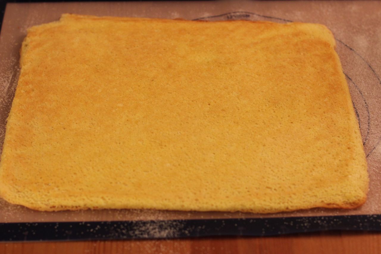 7) Stek sukkerbrødet midt i ovnen i 6-8 minutter. Den vil nå ha blitt mer luftig og brunlig på toppen. Avkjøl litt, gjerne på rist. Når den avkjøles vil en del damp forsvinne og den vil lett få noen sprekker når du ruller, det er ikke så farlig, men hvis du vil unngå det kan du legge et «lokk» over mens den kjøler seg litt ned, så holder den på fuktigheten.