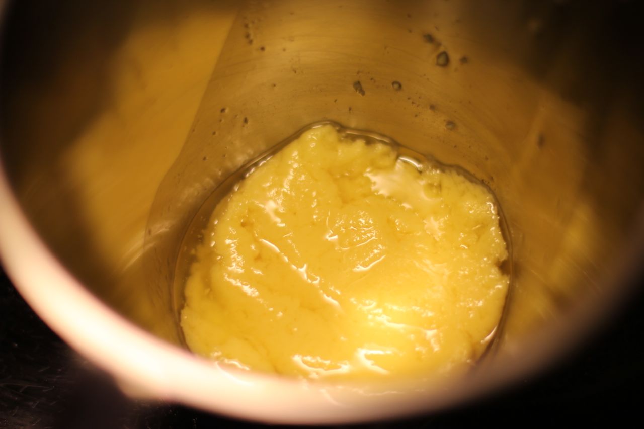 Som dere kan se har oljen lagt seg litt på utsiden av eggemassen, i stedet for å bli inkorporert. Dette resulterer ikke i ordentlig majones. Typisk tegn på at man har vært for ivrig med oljen. 🙂 Da er det på tide å stoppe den ordinære majoneslagingen og begynne å fikse.