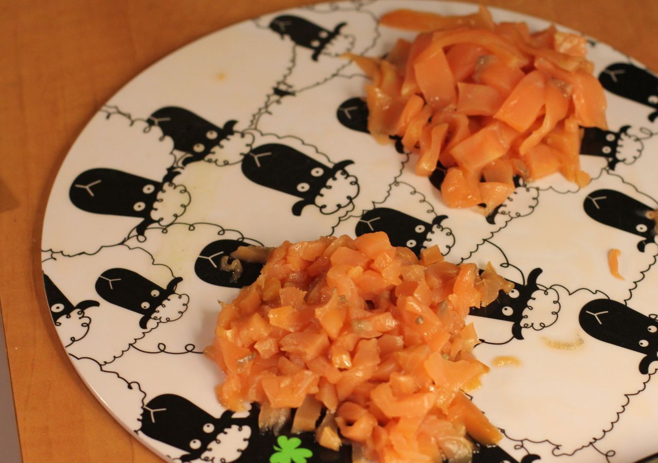 1) Mål klart alle ingrediensene. Skjær halvparten av røkelaksen fint og den andre halvparten grovt (se bilde under). Rør halvparten av smøret (20 g) mykt, og rør inn den finhakkede laksen slik at du får et «laksesmør». (For å spare tid kan du gjøre dette senere i prosessen, parallelt med at du koker inn kraften.)