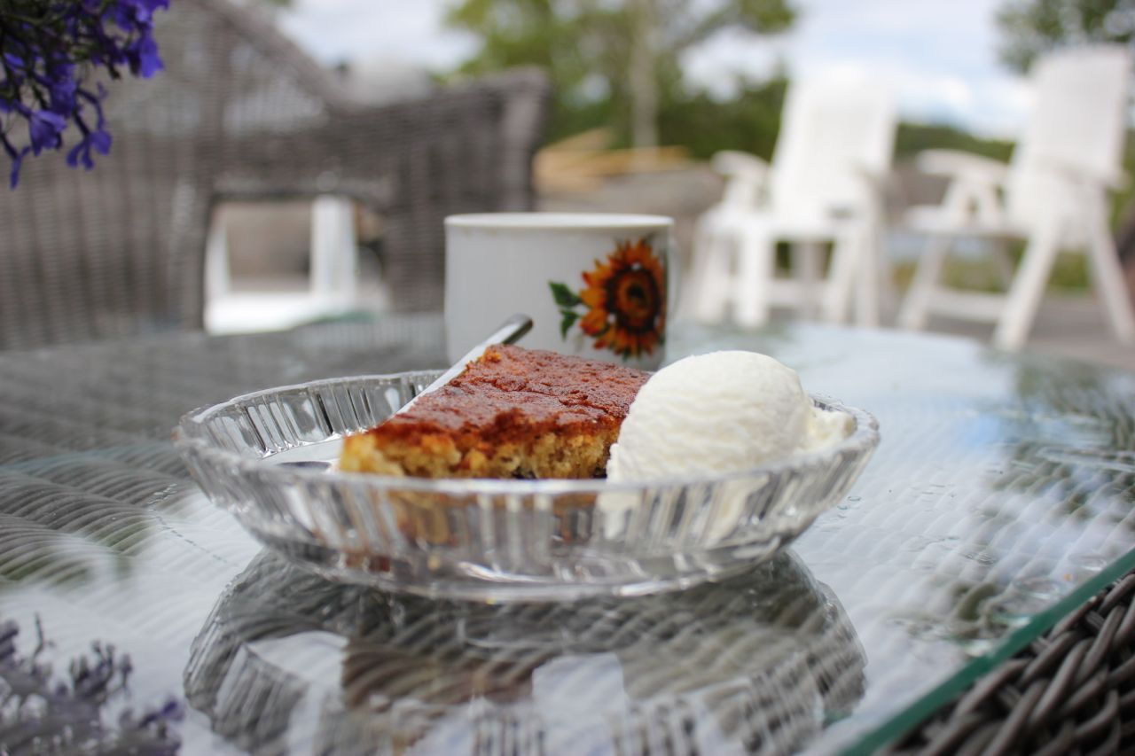 Servér med vaniljeis eller sjokoladeis, gjerne en solskinnsdag. Legger ved et stemningsbilde. Enjoy!