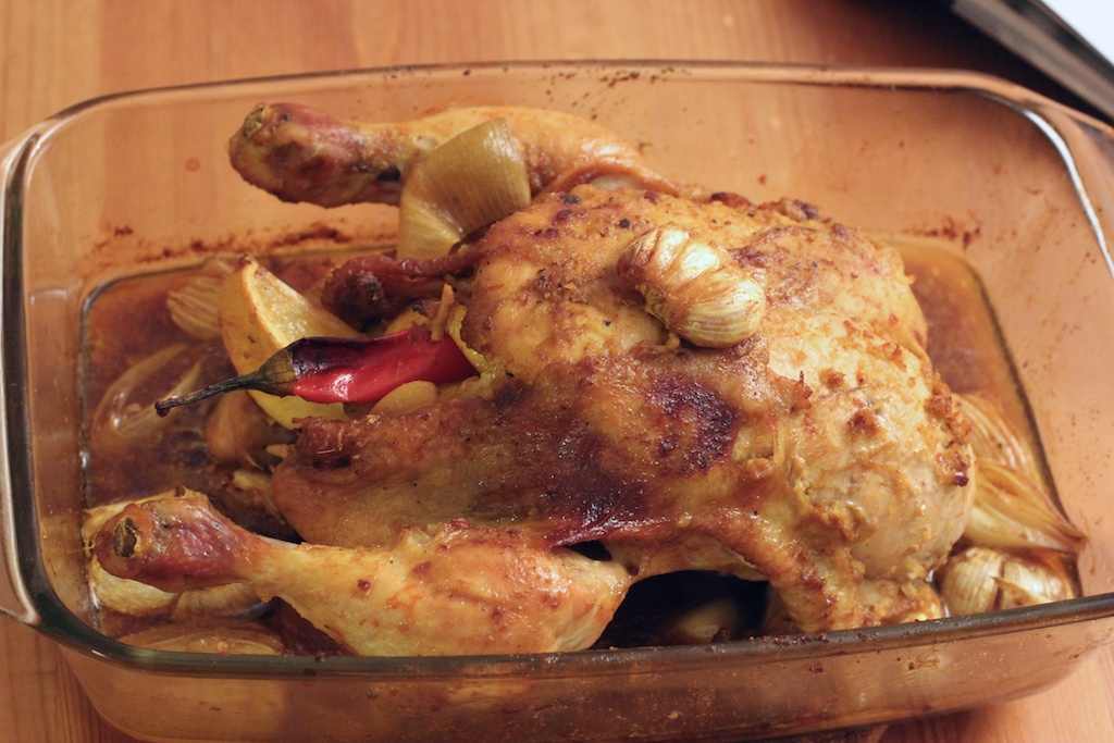3) Bland ingrediensene til krydderblandingen i en liten kopp. Legg kylllingen over i den ildfaste formen (gjerne en vid form hvis du har). Gni kyllingen inn med olivenoljen og deretter med krydderblandingen, slik at alle sidene av kyllingen er dekket av krydderet.