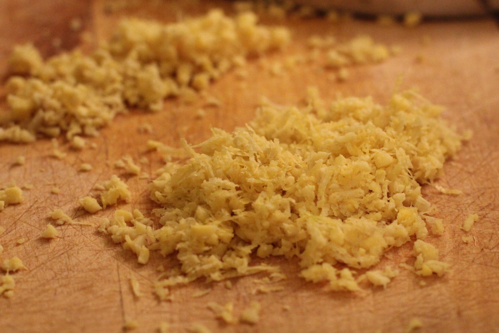 1) Sett ovnen på 180 grader Celcius. Finriv (eller finhakk) ingefær og finriv sitronskall (bare det gule av en sitron du har vasket godt) og bland dette godt sammen. (Tips: fersk ingefær skal være litt gulaktig på fargen, hvis den har hint av grå/blå kan du med fordel skjære vekk disse bitene og heller bruke delene av ingefæren som er mest gul).