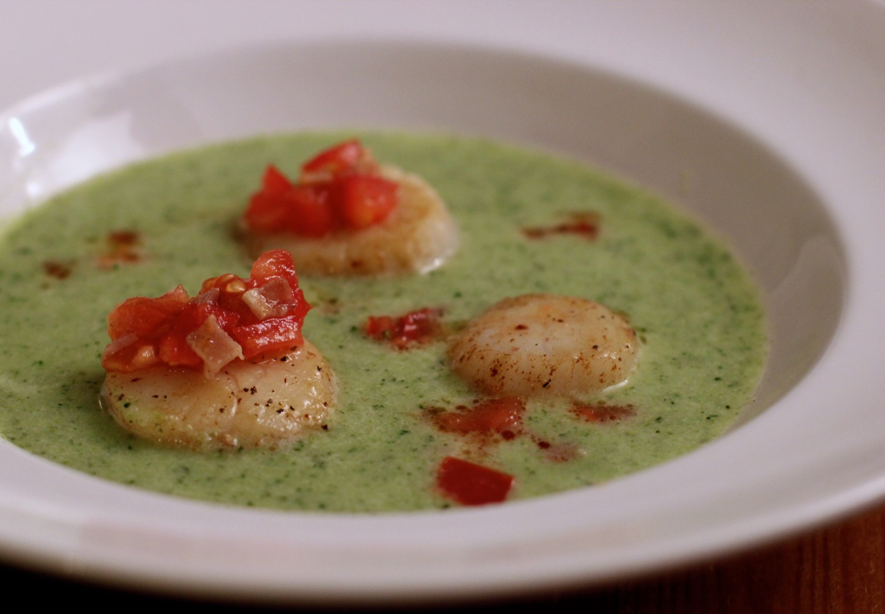 Denne retten kom som et resultat av at det var søndag + mye regn på utsiden (=kjekt å slippe å gå på butikken), en kikk i fryser og kjøleskap og (på grunn av 2 timers titting på Top Chef på tv) en overflod av ideer til hva vi kunne lage. Etter alle ideene ble pitchet ovenfor resten av husholdet landet vi på ideen om å lage en brokkolisuppe med kamskjell. Jeg hadde noen kamskjell som ble lagt i fryseren rett før jul, så det var i boks. Den tentative oppskriften endret jeg sikkert tre ganger, men endte altså opp med å skrible ned ingredienser og fremgangsmåte der suppen og kamskjell tilberedes separat. Visjonen innebar også at en tomatsalsatopping var bra greier. Brokkoli og kamskjell er jo en klassisk smakskombinasjon (ikke så klassisk som blomkål og kamskjell kanskje, men veldig nær). Kamskjell skal tilberedes forsiktig, slik at de beholder den gode, myke konsistensen. Derfor ble de ikke tilsatt i suppen under tilberedning, men bare brunet i baconfett veldig raskt i panne.