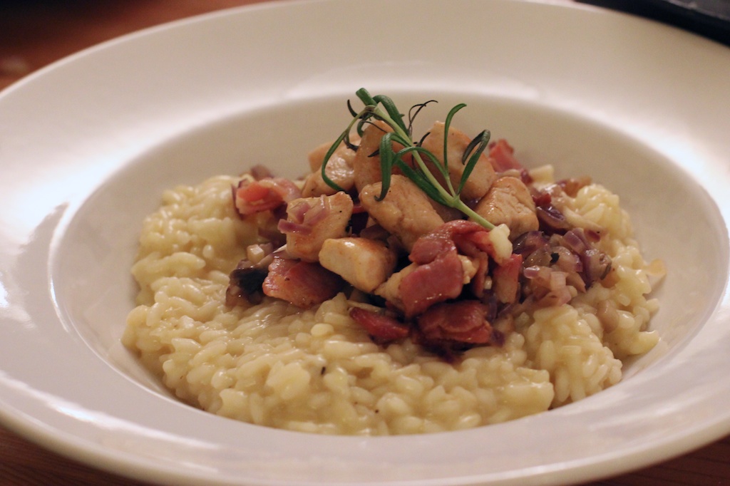 I dag sto risotto på menyen igjen. Denne gangen valgte jeg å servere risottoen med kylling og bacon. Temamessig tenkte jeg å lage en risotto som jeg får litt høst og skog-assosiasjoner til. Smaksmessig tenkte jeg å lage en umami-bombe. Umami er jo den relativt sett nyoppdagede femte smakssansen (mer om det her). Jeg synes umami smaker svært godt i risotto, og derfor ble både soyasaus, parmesan og sopp sentrale ingredienser (de har alle en kraftig umamismak).