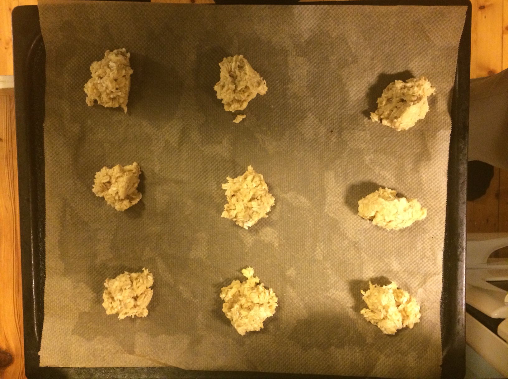 6. På en bakepapirkledt stekebrett, legg små ”topper” med deig, med god avstand mellom (de flyter ut ved steking).