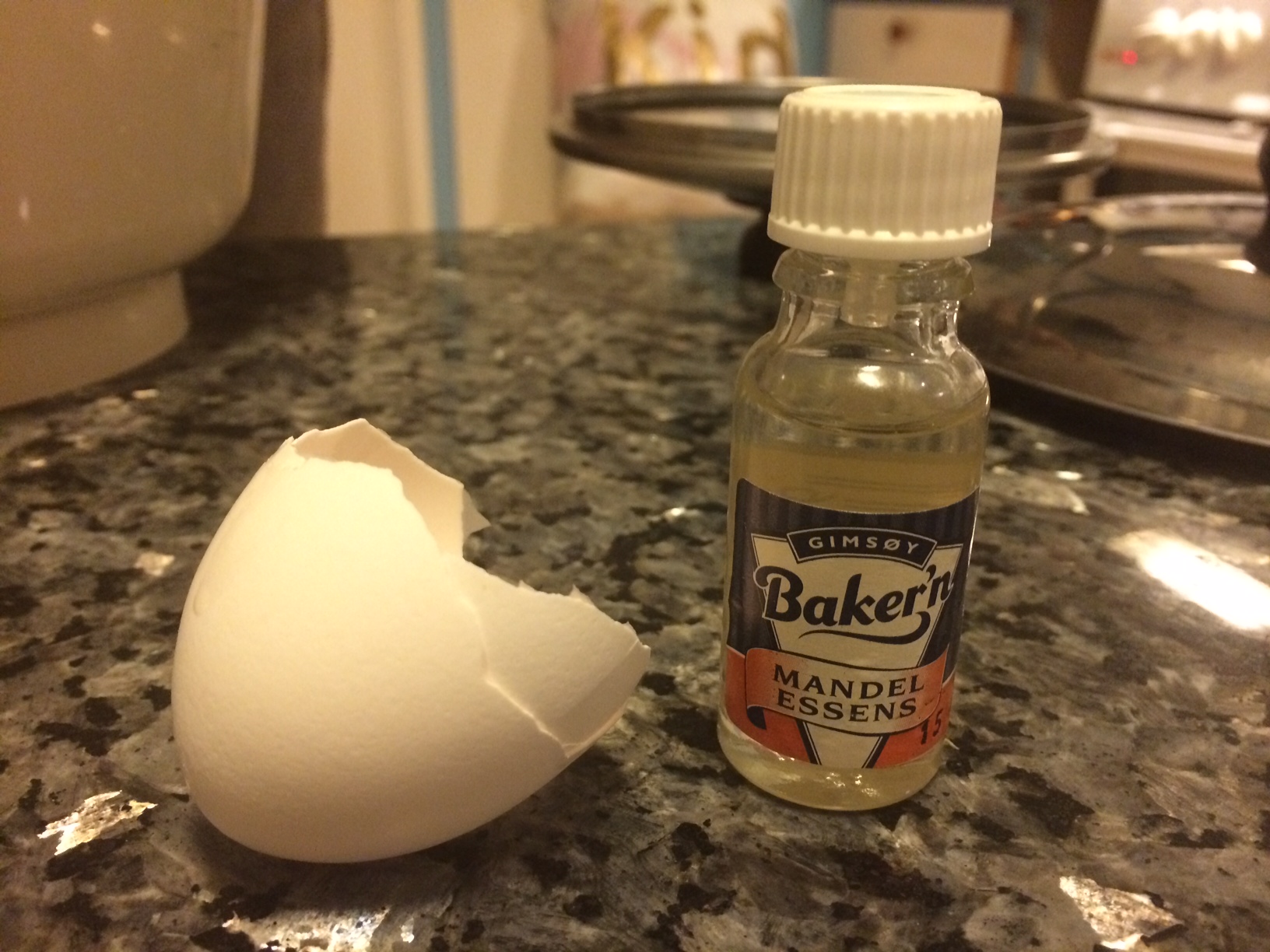 Det skal også tilsettes mandeldråper for å få frem en god smak. Mandeldråper inneholder svært konsentrert smak, og fås kjøpt på små flasker (på størrelsen med et egg) i bakehylla på butikken.