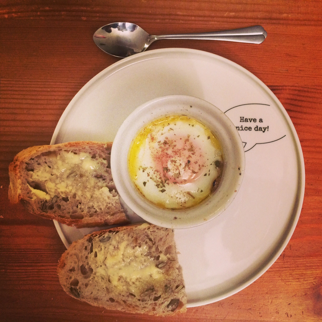 Egg i kokott innebærer at egget varmebehandles i en kopp som er satt i vannbad (altså litt samme metode som når man lager crême brulée). Oppskriften jeg har tatt utgangspunkt i (og modifisert noe) er fra den italienske kokeboken Sølvskjeen. Jeg har laget retten med sardiner nå en tre-fire ganger, og det blir en fin balanse – sardinene gir en fin salt kontrast til den søtere eggeplommen. Jeg som egentlig ikke spiser så mye sardiner synes dette er riktig så godt. Men – du trenger ikke lage retten med sardiner, det finnes et utall variasjonsmuligheter.