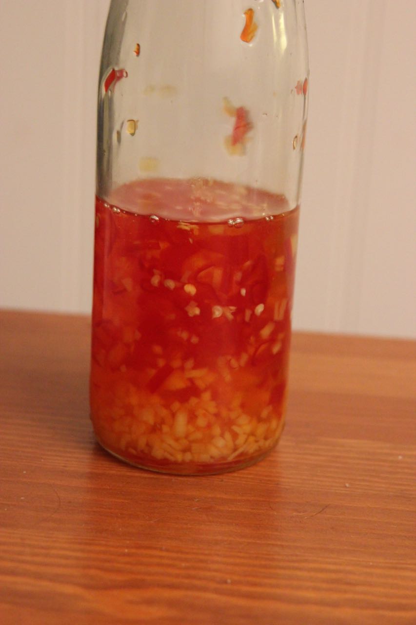 Jeg har nå en hel haug oppskrifter jeg har lyst til å dele med dere, og begynner med denne, som jeg nå er blitt ganske så hektet på! For en stund tilbake bestemte jeg at jeg ville forsøke å lage hjemmelaget sweet chili-saus. Erfaringen er at det er både lett, enkelt og mye bedre og friskere på smak enn ferdigkjøpt saus. Det tar faktisk bare tjue minutter å lage sweet chilisausen (pluss nedkjøling), og hvis du bruker et rent glass holder den seg nesten uendelig (mye sukker og eddik gir god konservering). Ta gjerne vare på flasken etter du har brukt opp en sweet chilisaus fra butikken, de er praktiske å bruke også til din hjemmelagde saus.