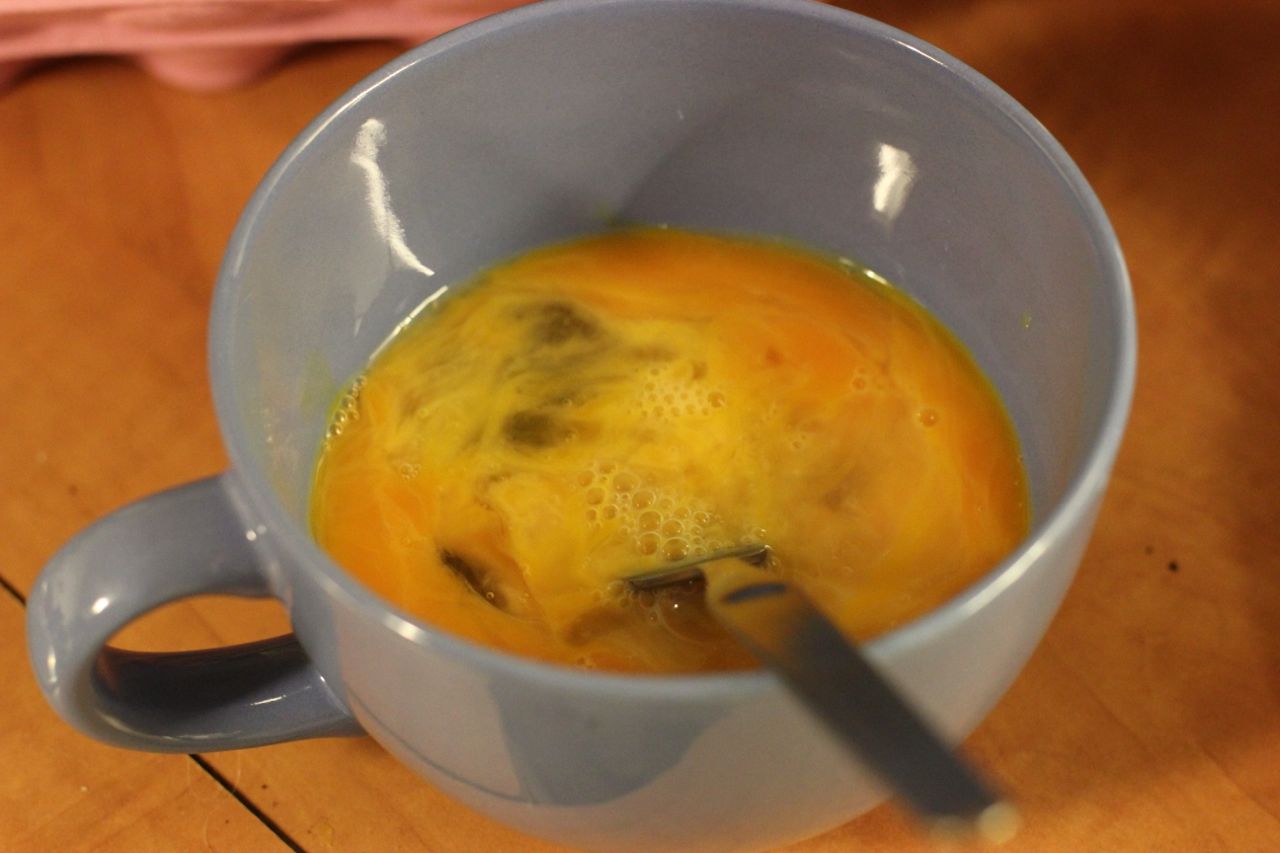 1. Bland lett sammen egg, salt, pepper og litt vann med en gaffel.