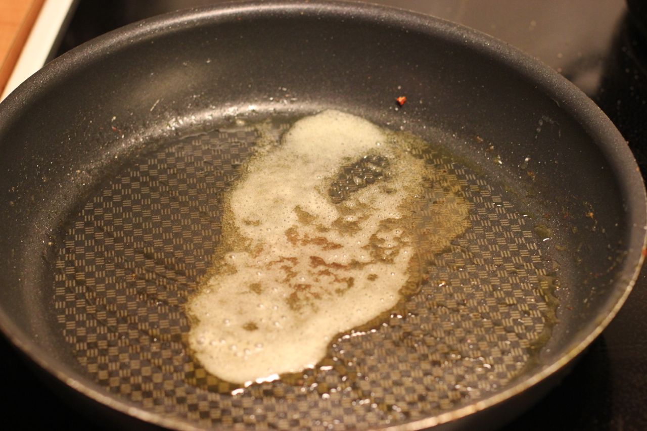 2. Sett stekepannen på høy varme, tilsett smør. Vent til smøret har sluttet å bruse og begynner å bli brunt, da skal du tilsette eggeblandingen.