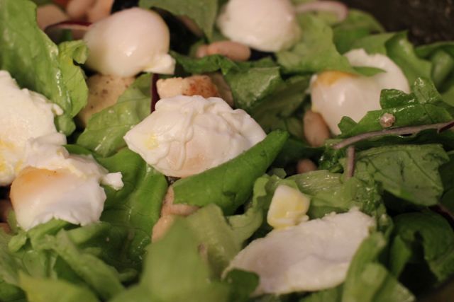 – I salat. Her har jeg laget salat med posjerte vaktelegg (posjeres på samme måte, men trenger ikke like lang tid som vanlige egg). I salaten ellers har jeg: salat, rødløk i strimler, hvite bønner, sorte oliven, kapers, hjemmelagde krutonger, kyllingbiter stekt i stekepanne og saltet og pepret. Vinaigrette – en del hvitvinseddik og tre deler extra virgin olivenolje (blandes raskt i en liten skål, helles over rett før servering). Salte og pepre salaten.